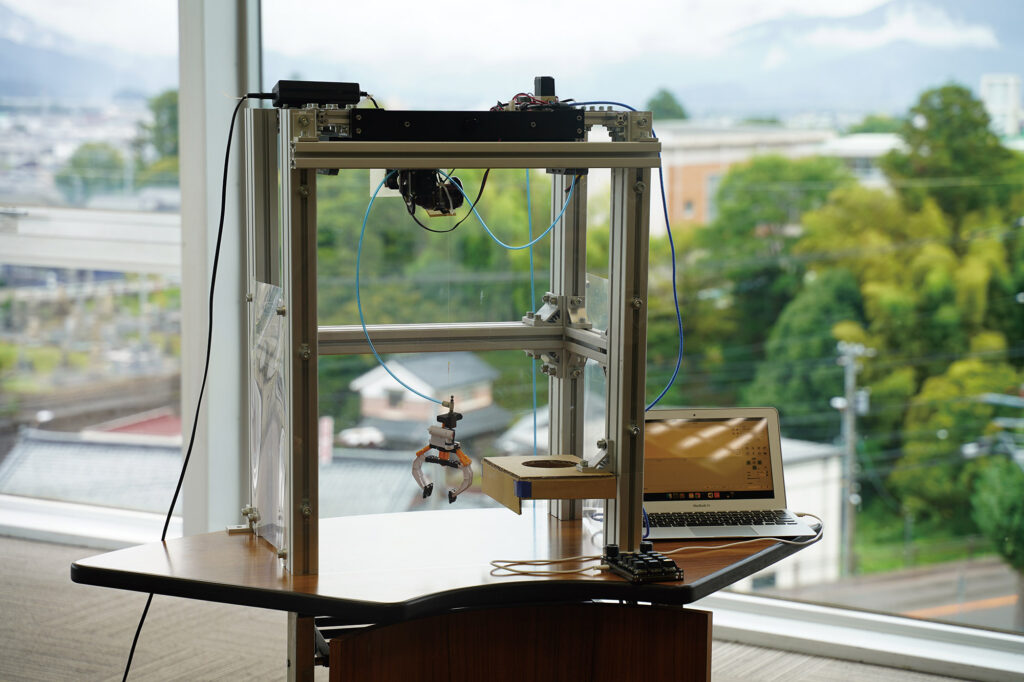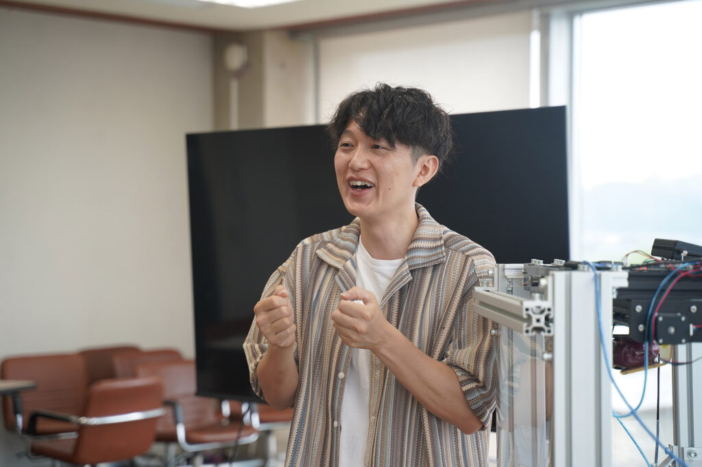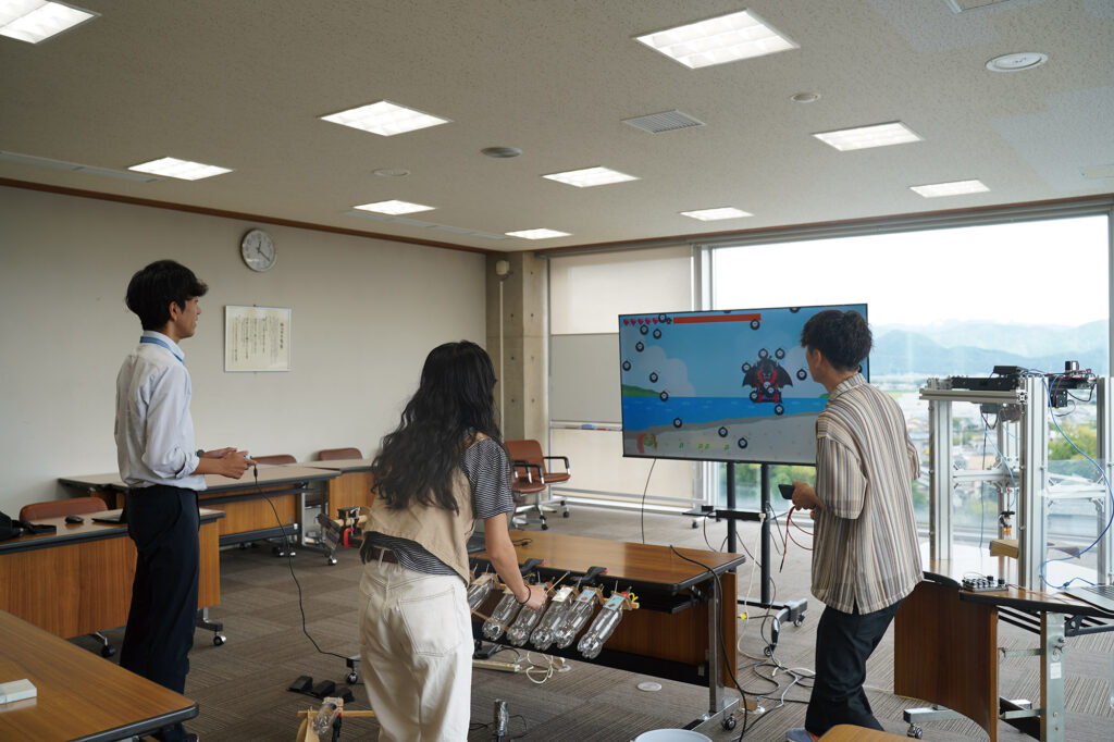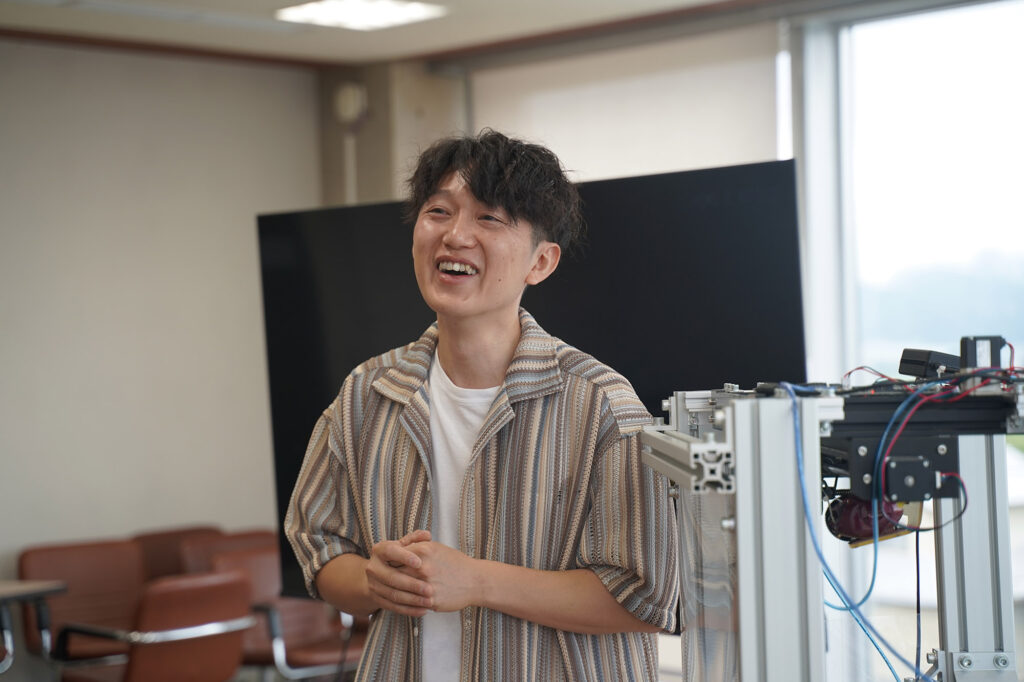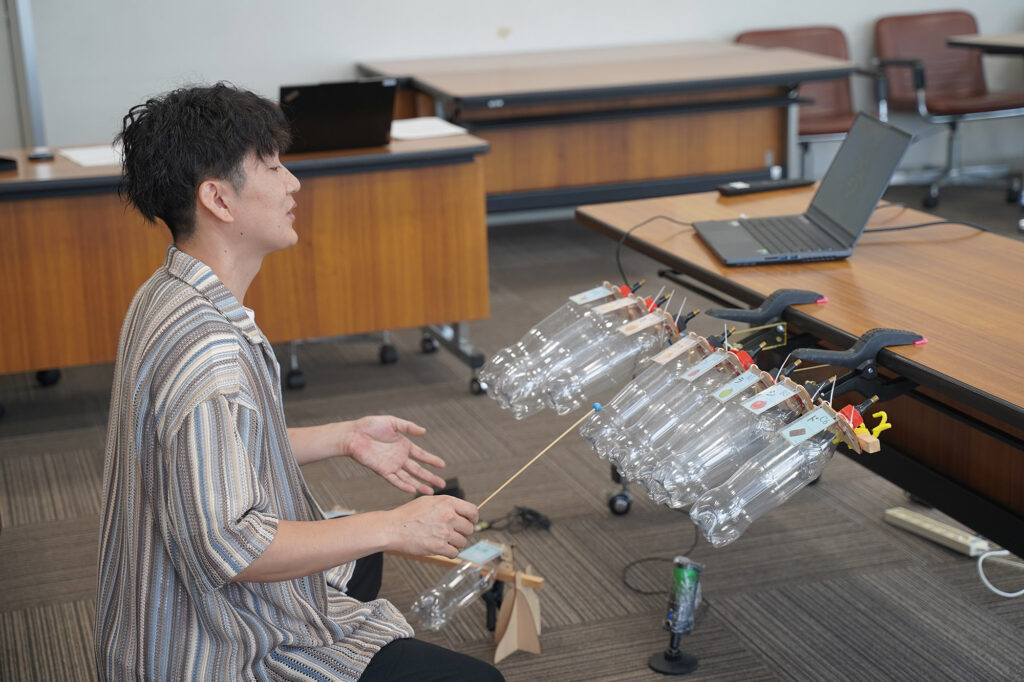 奥村 :「ゼロからものを組み立てられる、仕組みを作れるっていうのは僕の強みだと思うので、あまり無いシステムを作ってやってます。このペットボトルのゲームも、普通だったらボタンを押して、その入力信号でシステムを作ると思うんですけど、マイクで音を拾う音声入力にしています。ハンドルも、角度をカメラで判別できるんですよ」