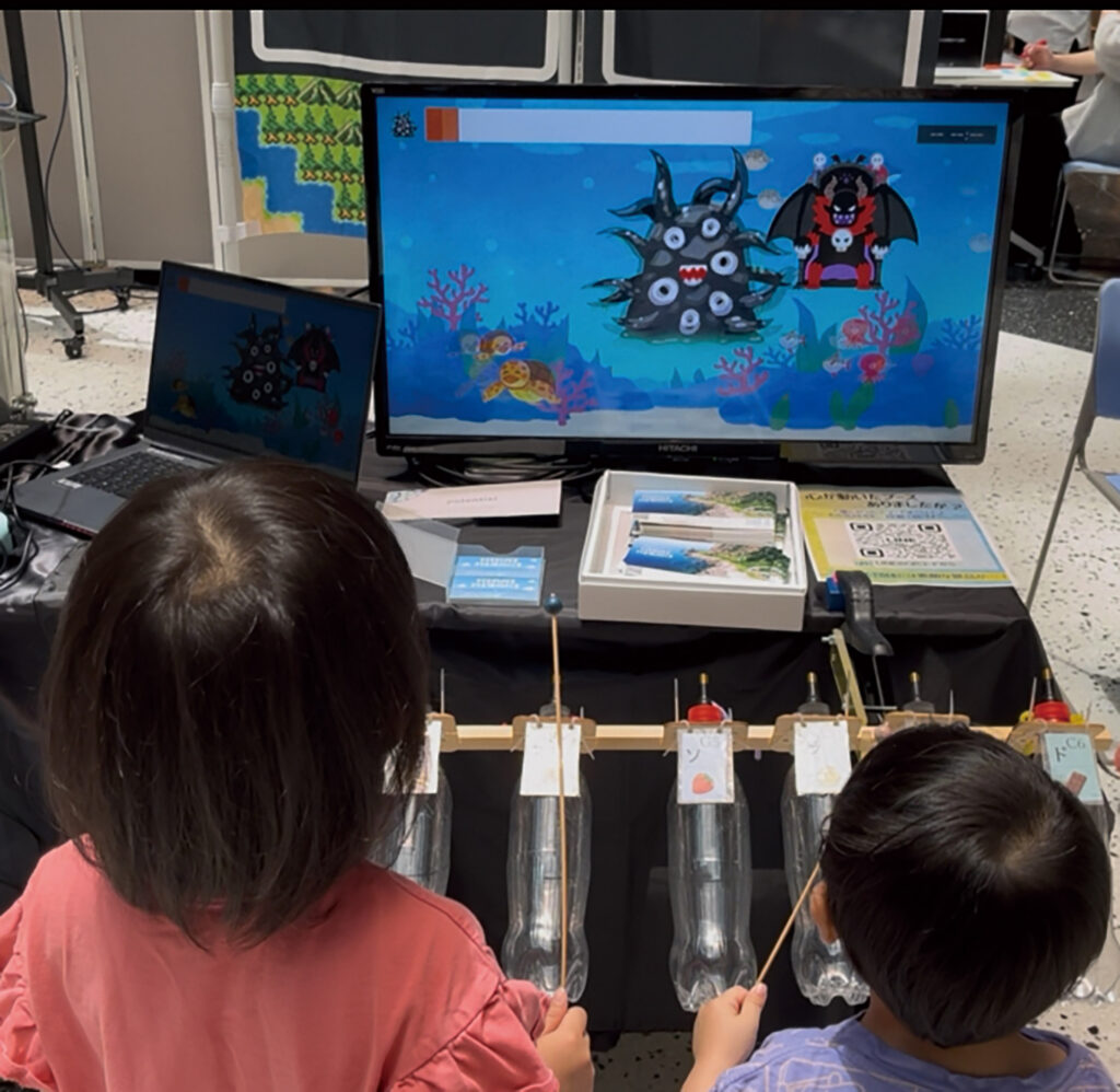初回の出店に引き続き、運良く2度目の出店機会をゲット。奥村さんは改良を重ねて、ペットボトルを叩いて海を汚す大魔王を倒すことができるシューティングゲームを新たに制作しました。